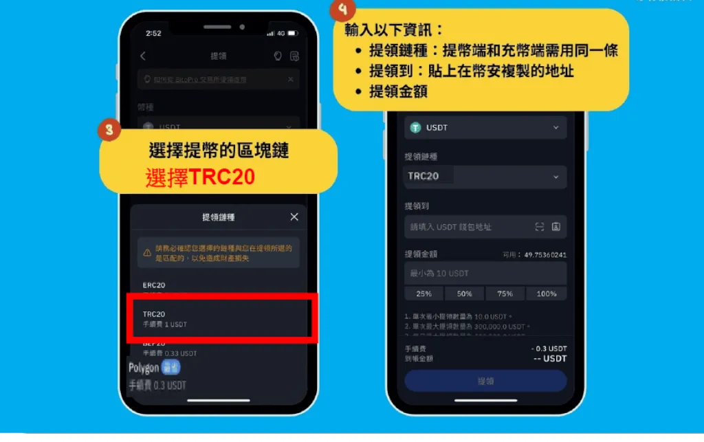 選擇提領USDT的協議TRC20,這個欄位要和步驟一填寫的協議相同,接著貼上步驟一複製的錢包地址,提領金額為系統提供的數字。